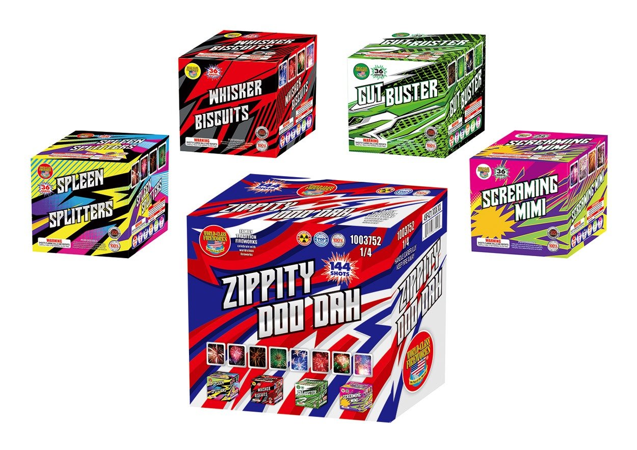 Each $5000 pallet includes 1 case of each of the following unless otherwise noted below by the (2x) for 2 cases. This Pallet Pack contains 43 cases with 177 multi-shot cakes with 9,258 shots total.