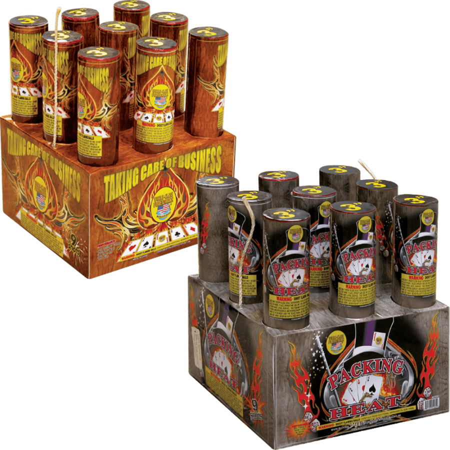 This 3 inch cake assortment comes with one piece of each product listed above. Packing Heat is a nine shot beauty that consist of multi-colored peonies backed by a beautiful silver wave. The two shot finale is sure to bring the audience to their feet. Taking Care of Business’s performance consists of 9 shots of brocade crowns that finish with various colored tips, including; green, yellow, red, and blue. A massive 2 shot finale lets the spectators know the show is over. This mixed case definitely brings the POWER to the HOUSE!!!